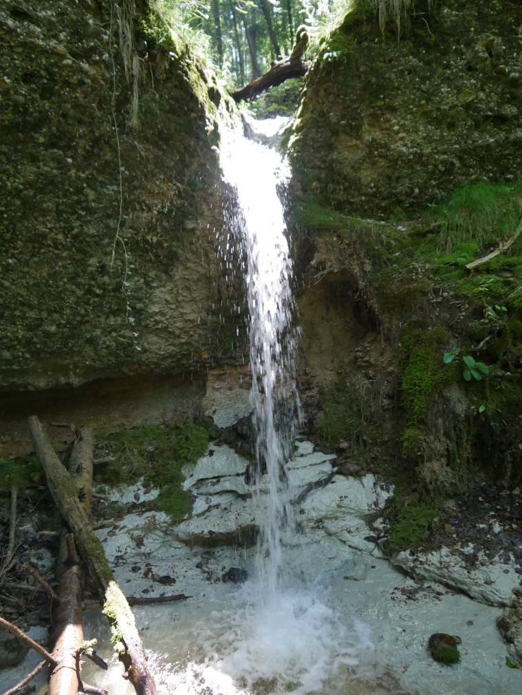 Danach machte ich mich Nass mit der Zahnbürste und Pasta auf zu einem etwa 50m von der kleinen Bachinseln entfernten Wasserfall, der von einer Quelle gespeist wurde, die etwa 100 Höhenmeter den Berg herauf lag und das Wasser von dort aus steil herab fließt, ehe es in dem etwa 3m-4m hohen Wasserfall mündet.